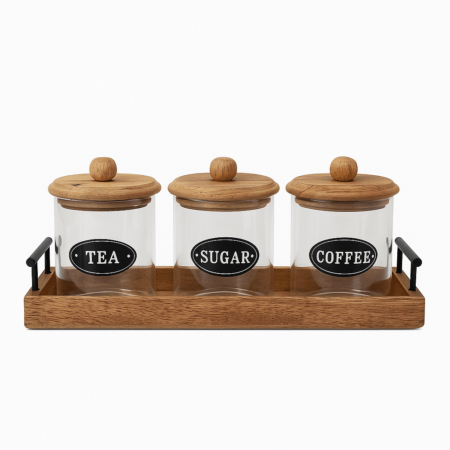 סט אחסון לתה קפה וסוכר מעץ מנגו עם מגש תואם