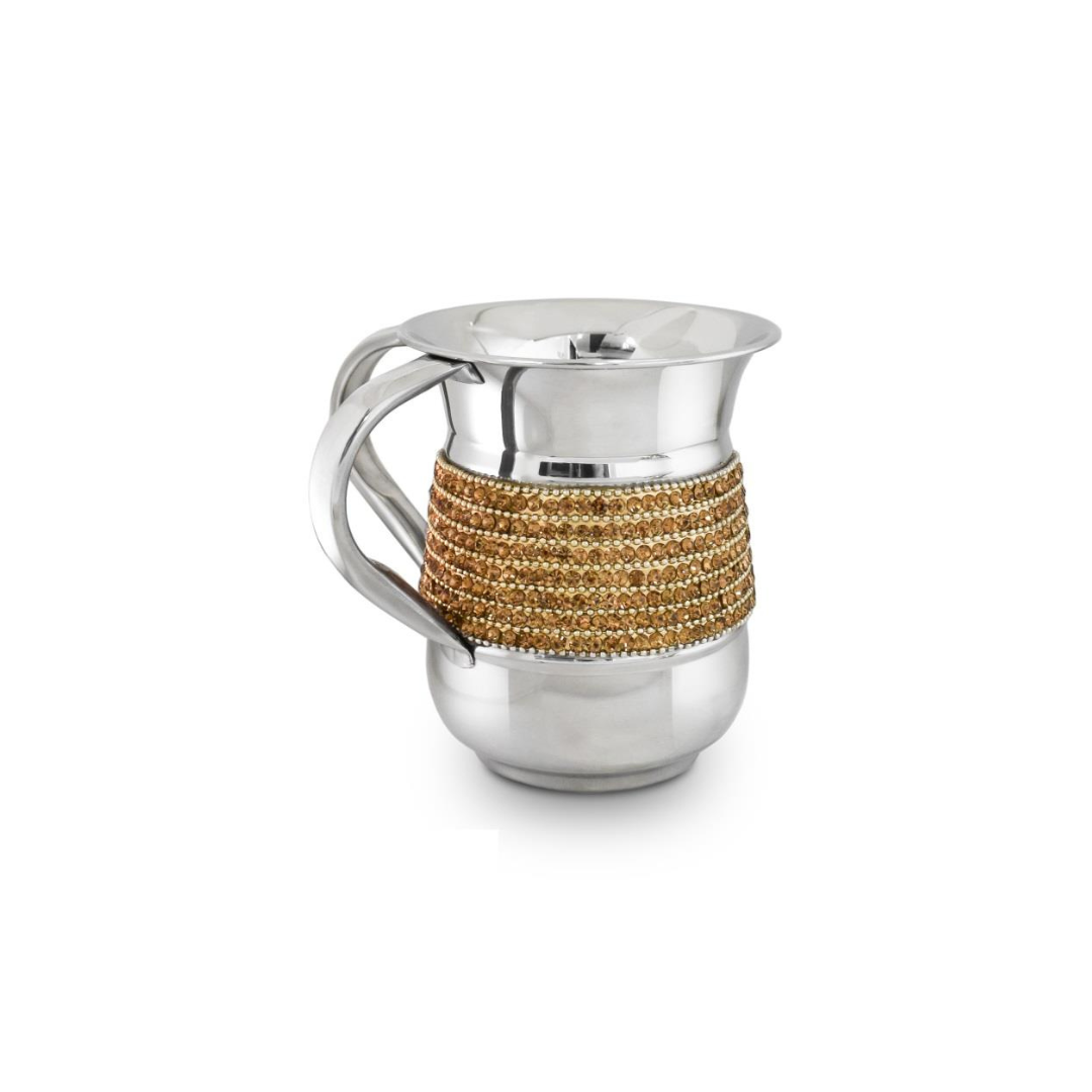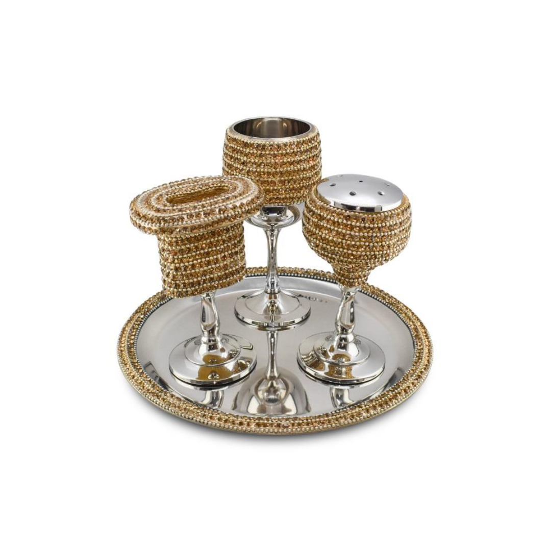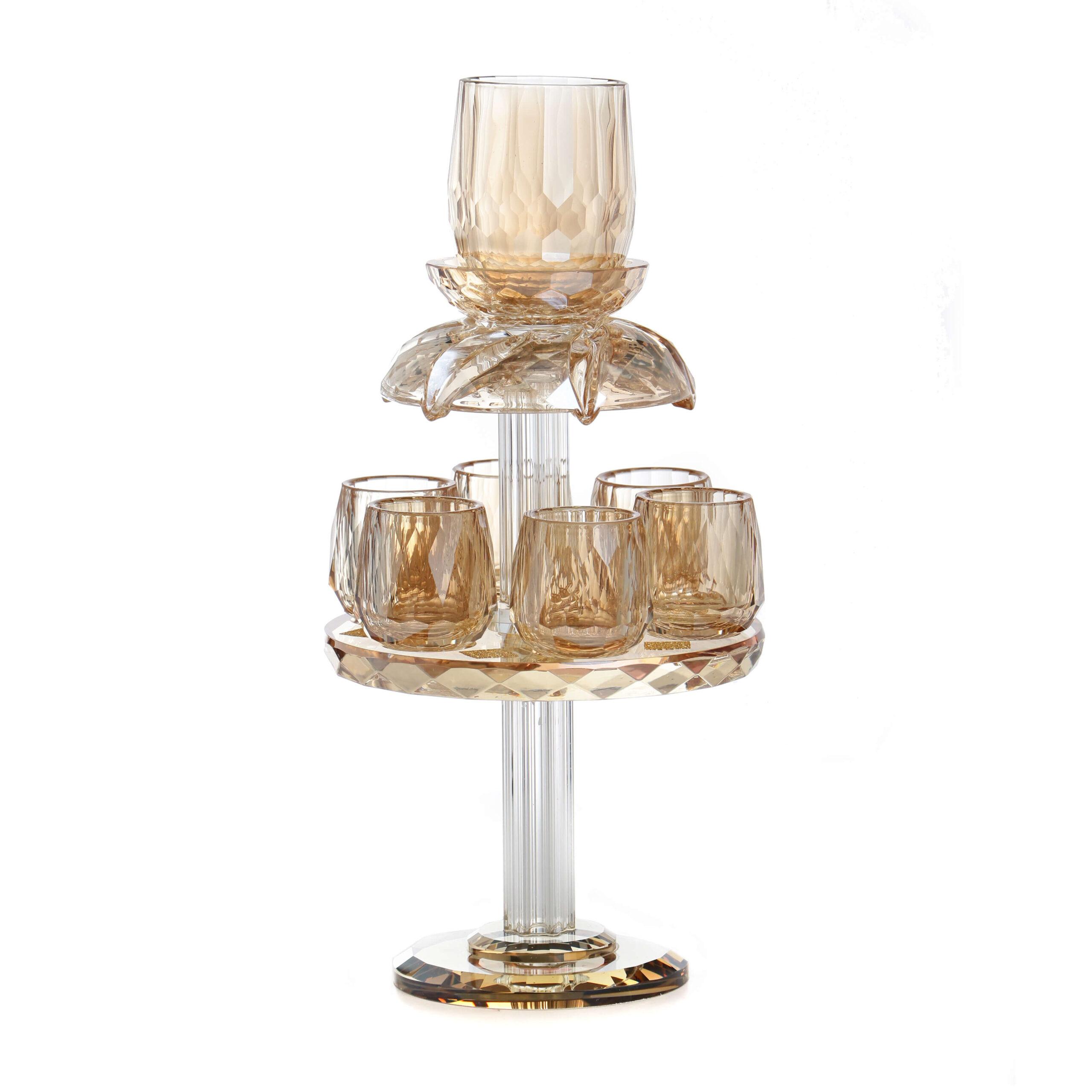 מחלק יין יוקרתי מקריסטל איכותי בגוון ענבר שקוף עם נגיעות זהב. כולל 6 כוסות תואמות במראה מבריק.