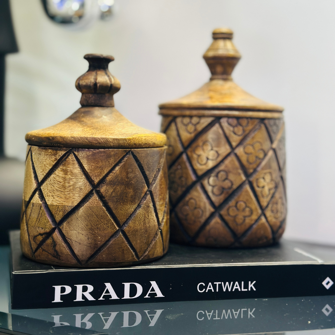 הכלי מעץ טיק ומעוצב עם פאטרנים בסגנון כפרי, מכסה לשמירה על הנר.
