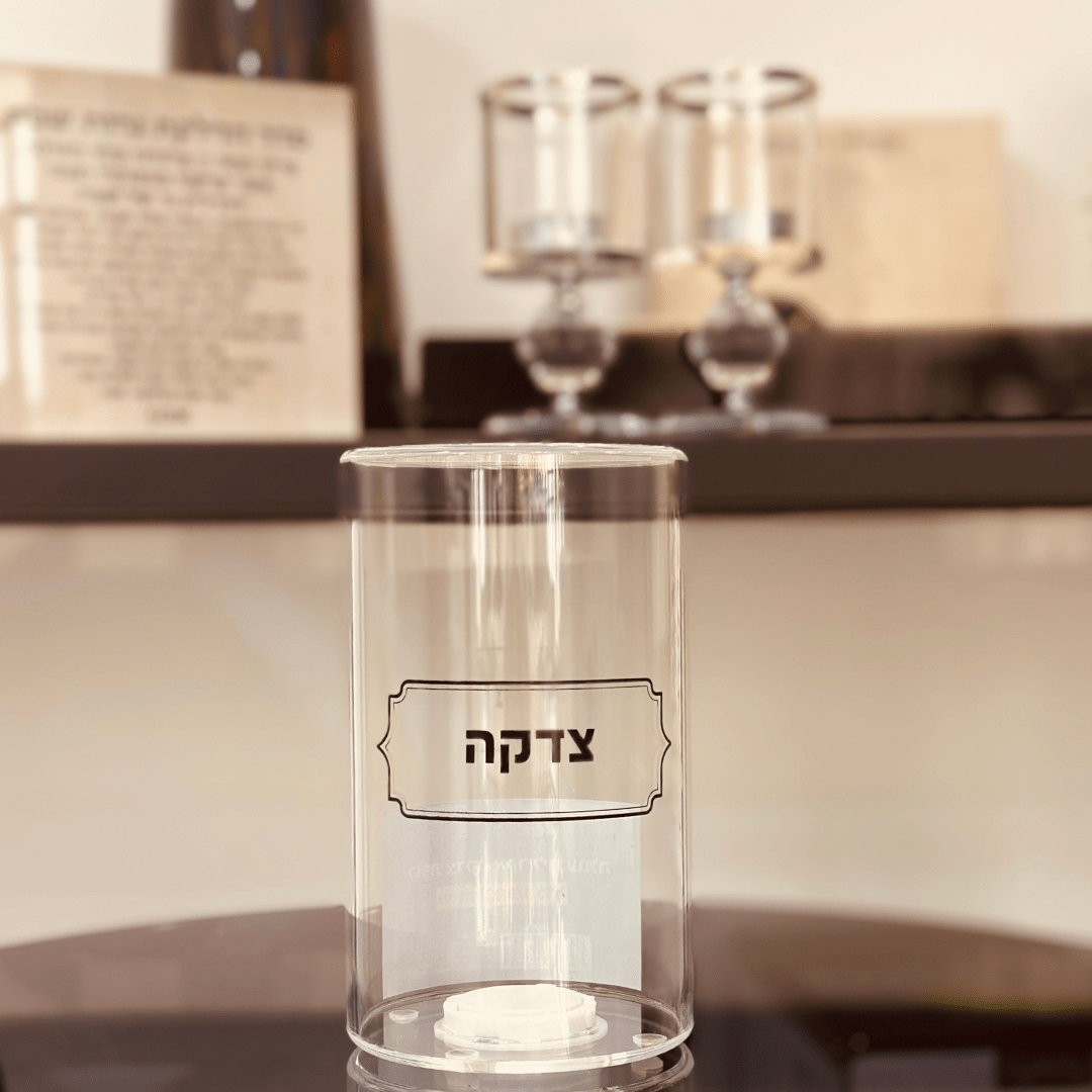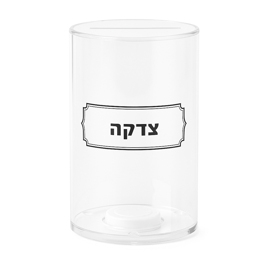 קופת צדקה איכותית ואלגנטית עשויה אקריל שקוף בעיצוב גלילי נקי.