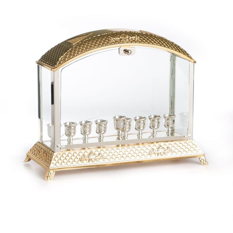 חנוכייה מעוצבת בסגנון אקווריום יוקרתי שילוב מתכת בגוון זהב מבריק ועיטורים עדינים בסגנון קלאסי.