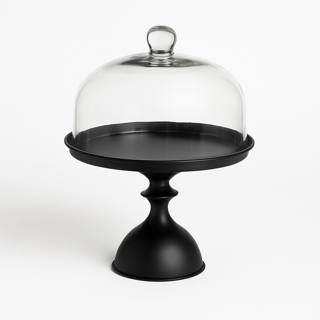מגש על רגל עגול בעיצוב מודרני ואלגנטי עשוי מתכת שחורה איכותית עם פעמון זכוכית שקופה.