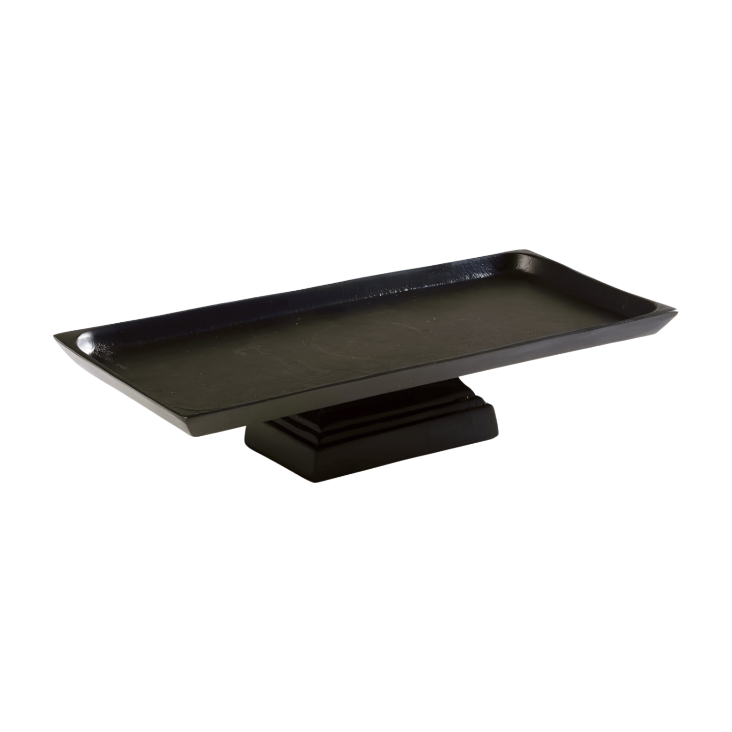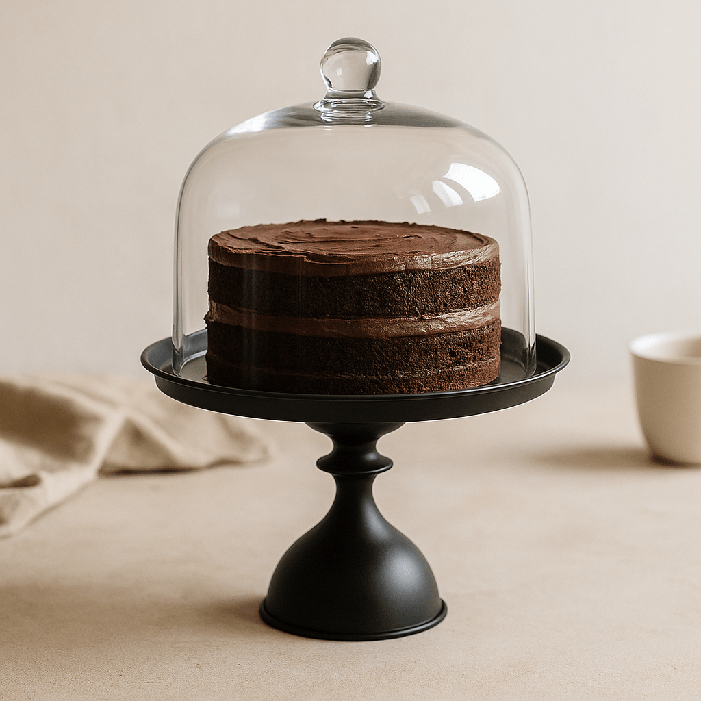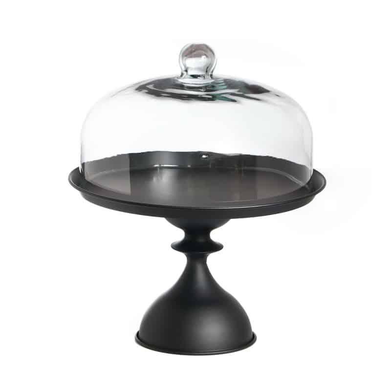 מגש על רגל עגול בעיצוב מודרני ואלגנטי עשוי מתכת שחורה איכותית עם פעמון זכוכית שקופה.