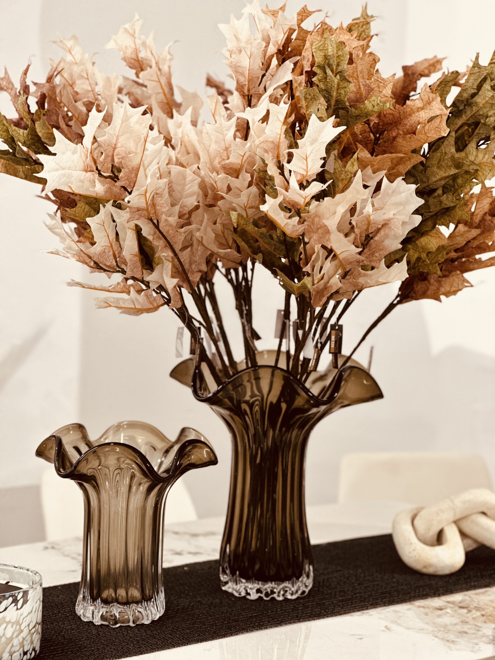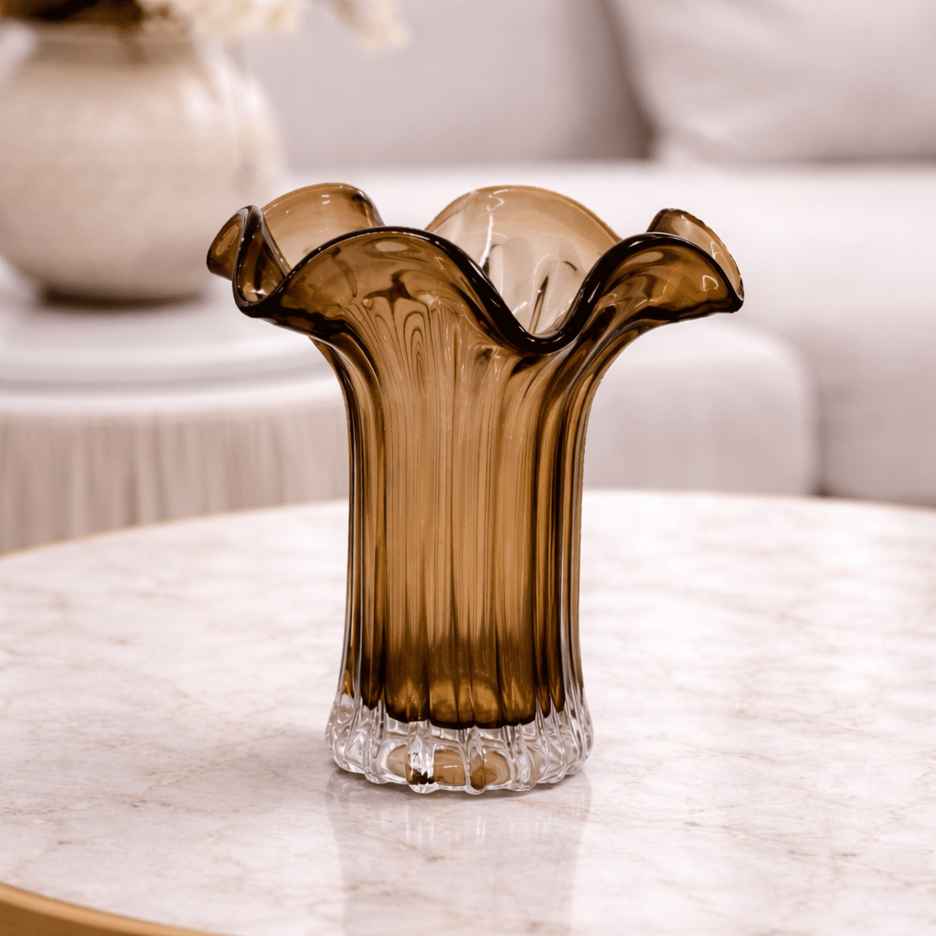 אגרטל זכוכית אירופאית יוקרתי בגוון חום עמוק, בעיצוב אלגנטי בעל שפה גלית מעודנת וגימור מחורץ המעניק עומק וטקסטורה עשירה.