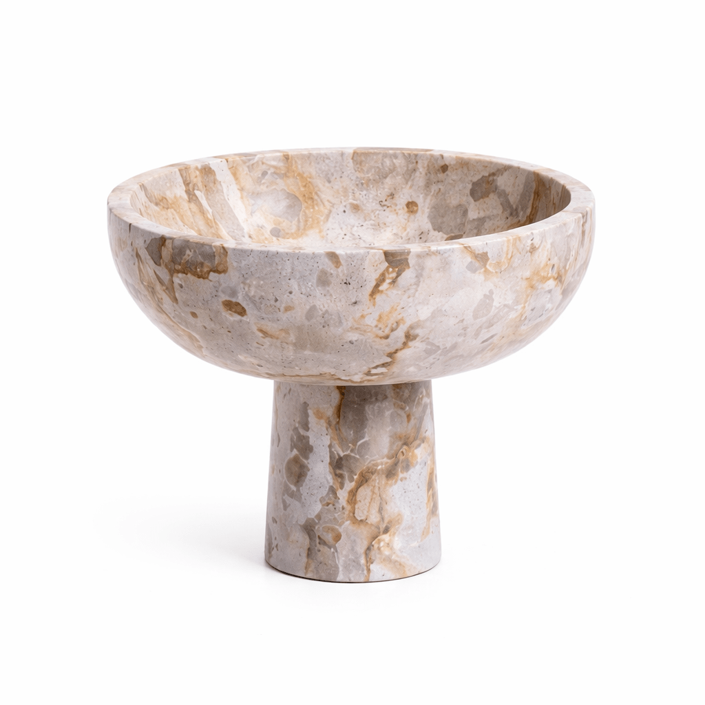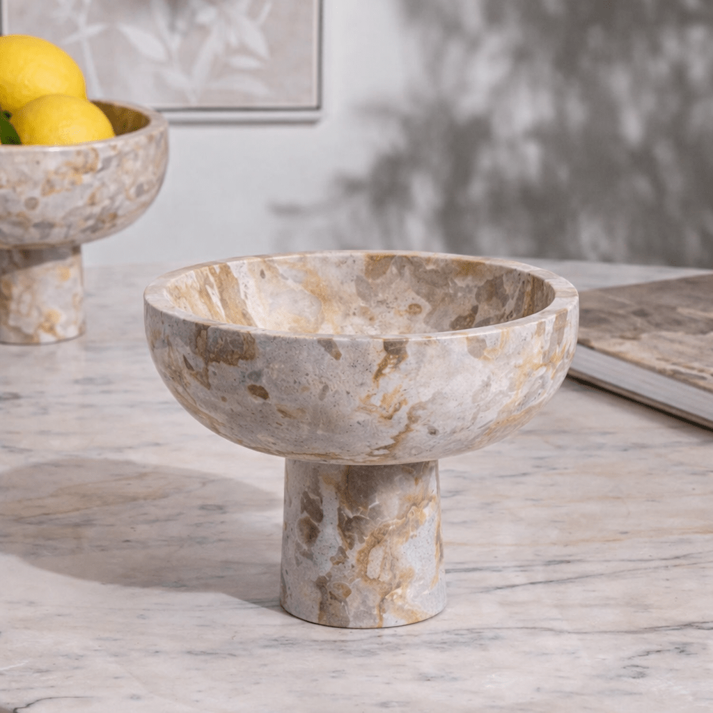 קערת Chocolate Marble עשויה שיש טבעי המשלב גוונים רכים של קרם, בז’ וחום בהיר עם ורידים טבעיים המשתנים מפריט לפריט כך שכל קערה היא יחידה במינה.