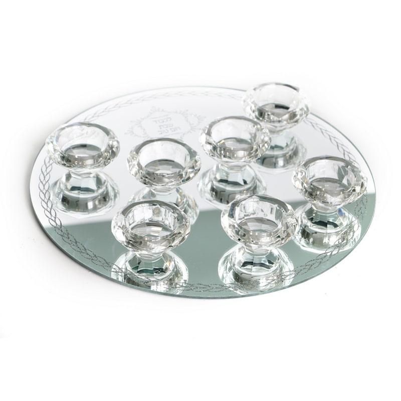 סט מרהיב של 7 פמוטים מקריסטל שקוף, המונחים על מגש מראה עגול בעיצוב אלגנטי בקוטר 30 ס"מ.