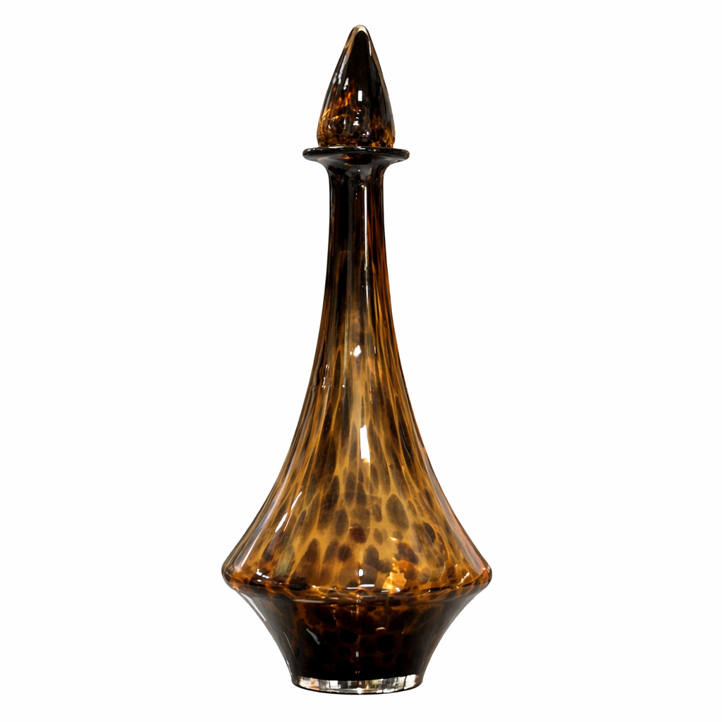 בקבוק דקורטיבי מזכוכית מנומרת בגוון חום עמוק בעיצוב אלגנטי ויוקרתי עם מכסה זכוכית תואם.