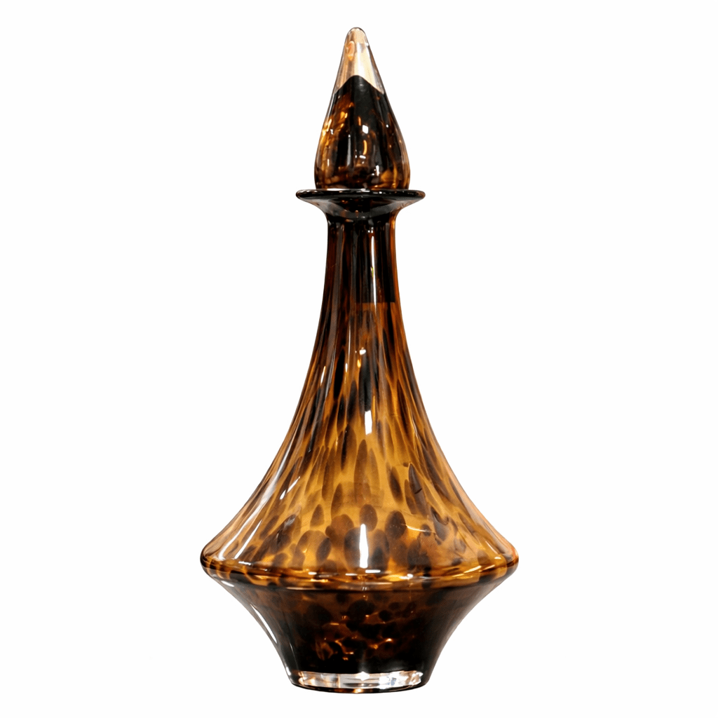 בקבוק דקורטיבי מזכוכית מנומרת בגוון חום עמוק בעיצוב אלגנטי ויוקרתי עם מכסה זכוכית תואם.