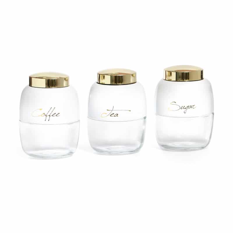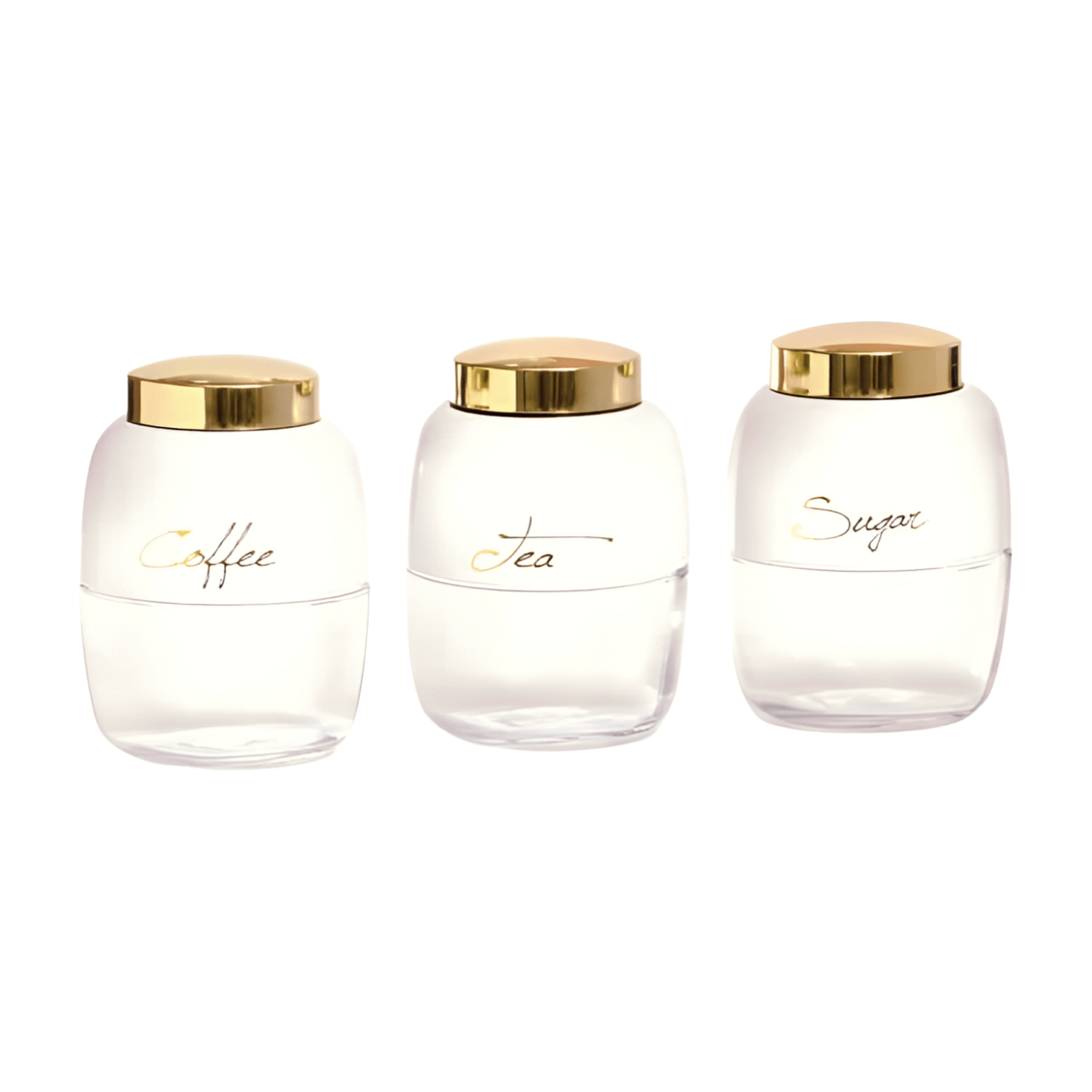 סט יוקרתי ומעוצב של שלוש צנצנות זכוכית לסגירה הרמטית ואחסון קפה, תה וסוכר.