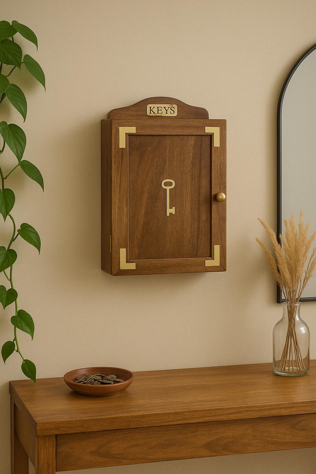 תיבת מפתחות בעיצוב קלאסי עשויה עץ מלא איכותי בשילוב פרטי מתכת מוזהבים.