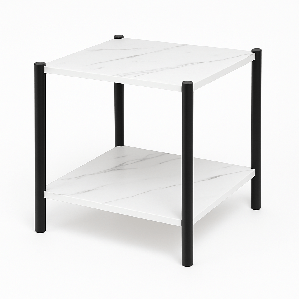 רגלי מתכת מושחרות במראה יוקרתי ושני מדפים רחבים דמויי שיש