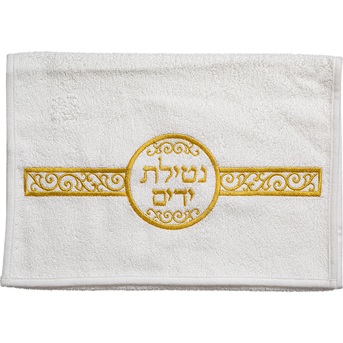 צבע לבן קלאסי עם רקמה מעוצבת של הכיתוב “נטילת ידיים” בגימור זהוב