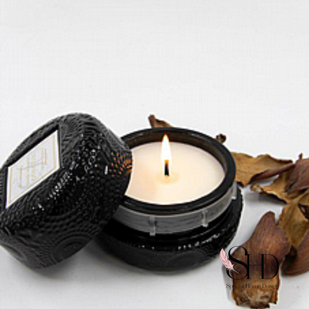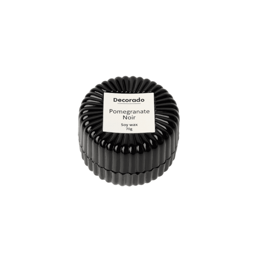 נר סויה איכותי יצוק בכלי קרמי שחור עם דוגמה בעיצוב מקרון לנוכחות יוקרתית בחלל.