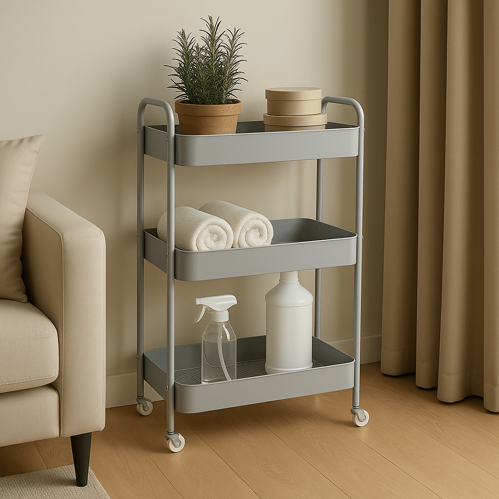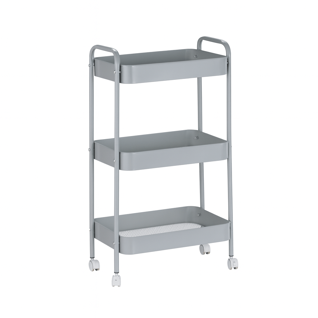 עגלת שירות 3 קומות, עשויה מתכת עמידה בצבע אפור נקי ומודרני.