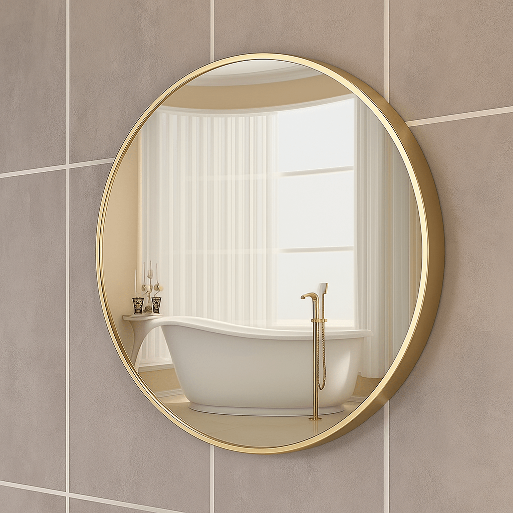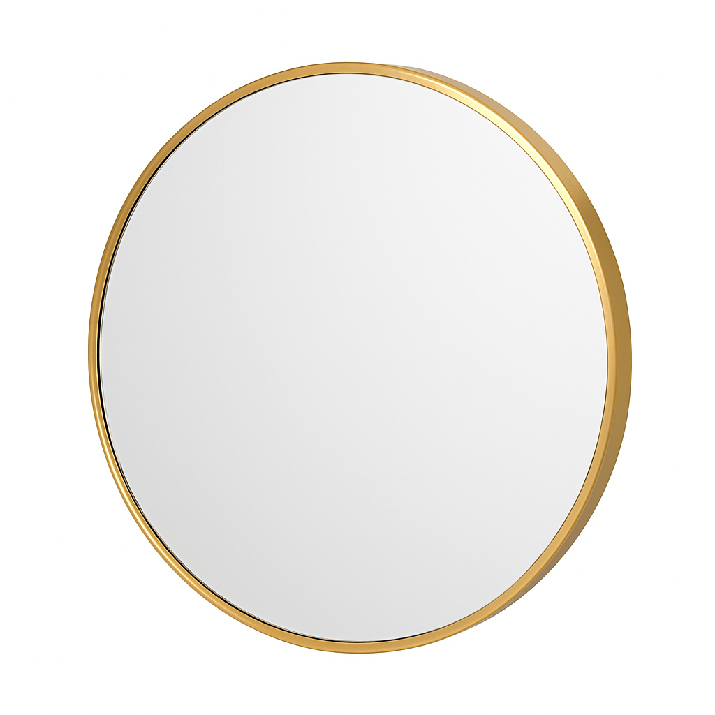 מראה עגולה בעיצוב קלאסי ומינימליסטי עם מסגרת אלומיניום זהב.