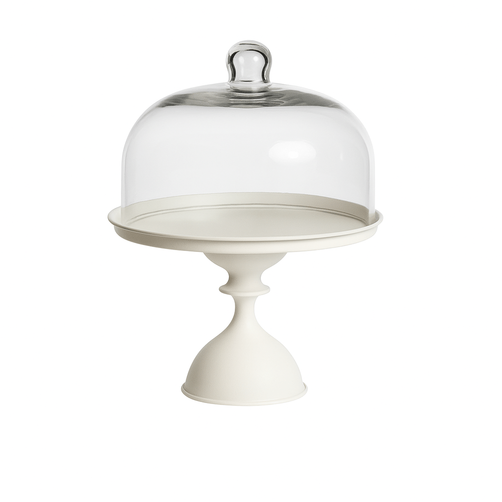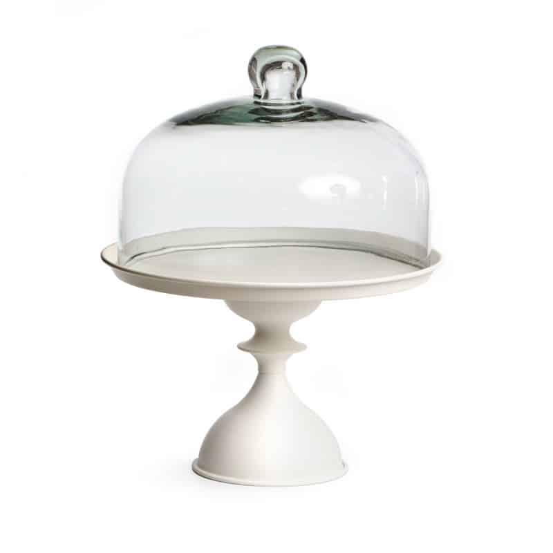 מגש על רגל עגול בעיצוב מודרני ואלגנטי עשוי מתכת לבנה איכותית עם פעמון זכוכית שקופה.
