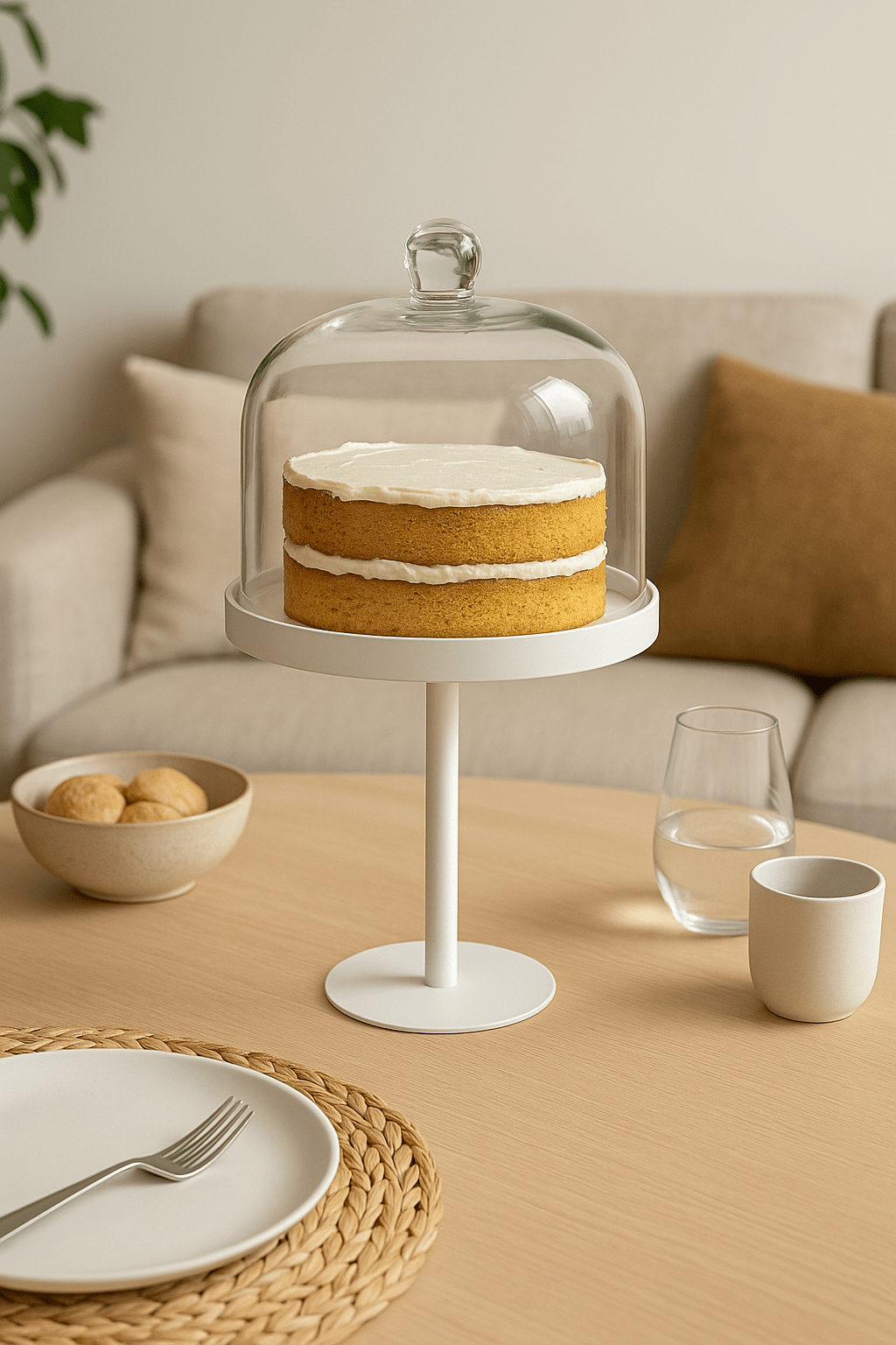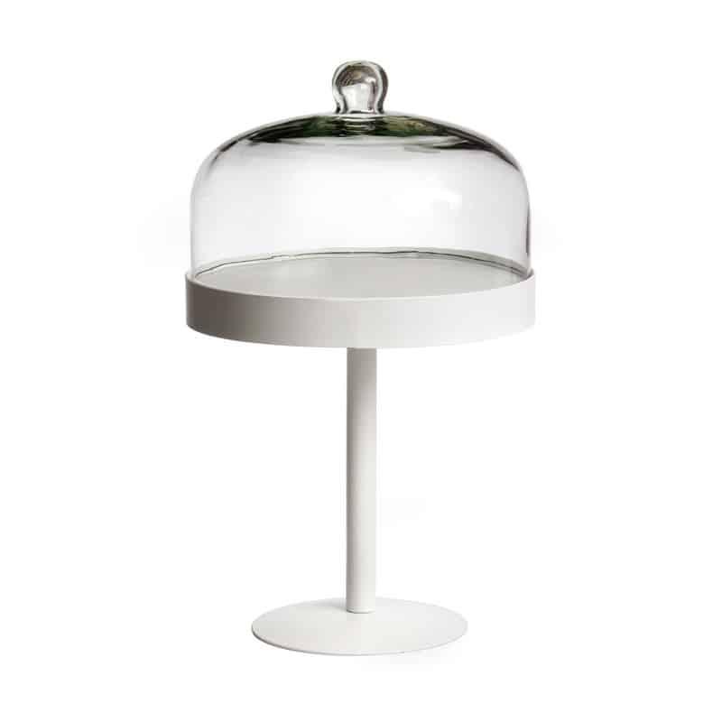 מגש על רגל בעיצוב קלאסי מודרני עשוי מתכת לבנה עם פעמון זכוכית שקופה.