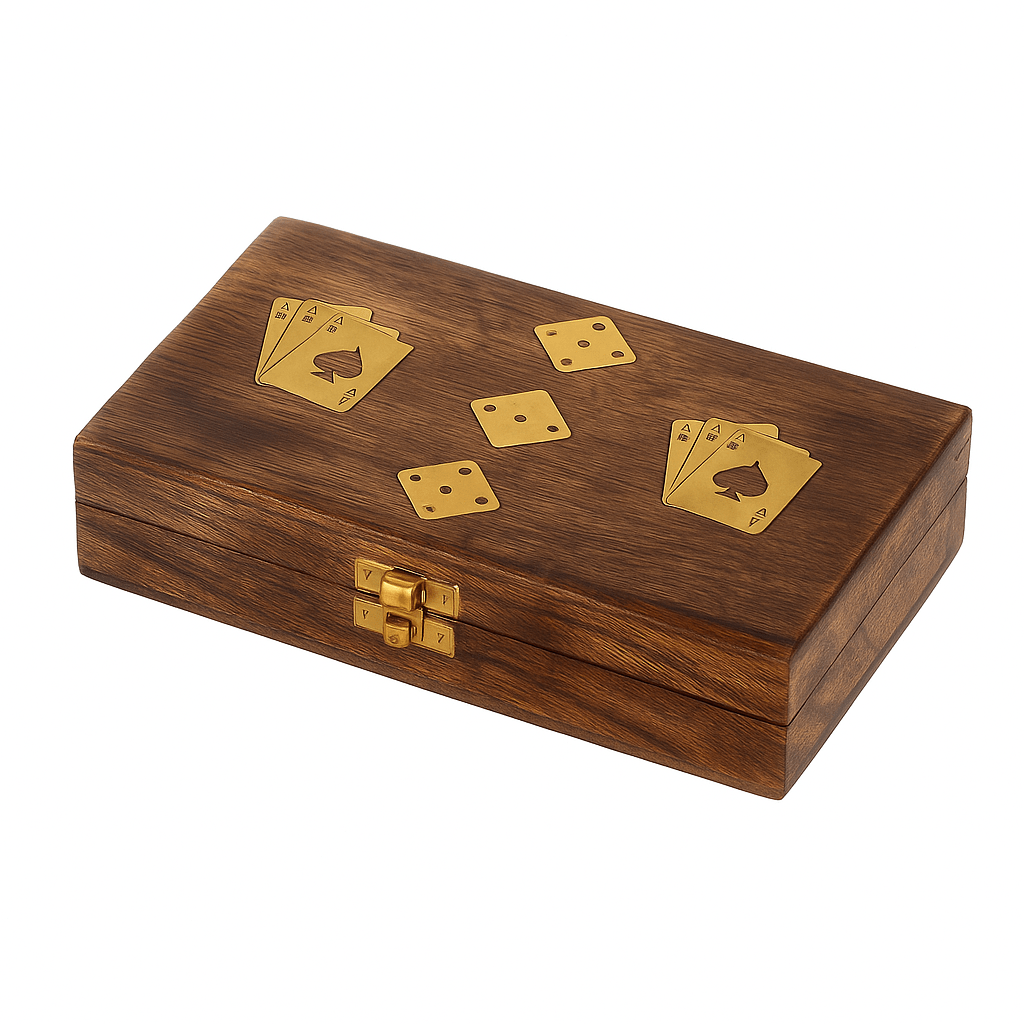 קופסת קלפים כפולה בעיצוב יוקרתי מעץ מלא עם עיטורי מתכת מוזהבים.